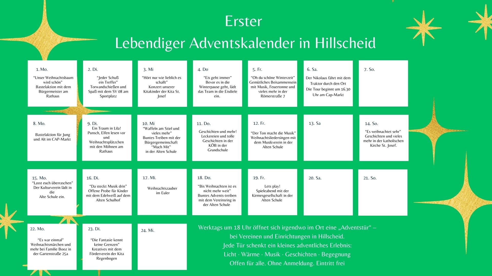 Hillscheid erlebt in diesem Advent eine Premiere: Zum ersten Mal findet in der Adventszeit ein Lebendiger Adventskalender statt. Vom 1. bis zum 24. Dezember öffnen an allen Werktagen um 18 Uhr Vereine, Gruppen und Einrichtungen ein „Adventsfenster“ – ein liebevoll gestalteter Ort des Treffens, Zuhörens und Innehaltens.