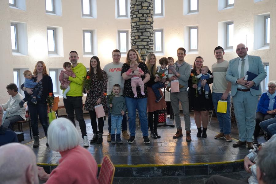 Für einen musikalischen Höhepunkt sorgte der Kinderchor Bunte Töne, der mit seinen Liedern das Publikum begeisterte und für strahlende Gesichter im Saal sorgte. Besonders berührend war anschließend die persönliche Begrüßung von fünf Neugeborenen, die gemeinsam mit ihren Familien willkommen geheißen wurden – ein starkes Zeichen für Zukunft und Leben in der Gemeinde.
