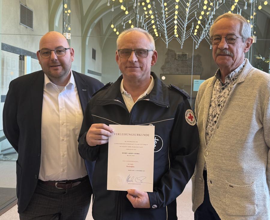 Darüber hinaus war Armin Georg über viele Jahre im Rettungsdienst, in der Aus- und Weiterbildung sowie im Sanitätsdienst bei kommunalen und überörtlichen Veranstaltungen aktiv. Während der Corona-Pandemie übernahm er gemeinsam mit vielen Mitstreiterinnen und Mitstreitern Verantwortung beim Aufbau und Betrieb von Teststrukturen und leistete damit einen wichtigen Beitrag zur Aufrechterhaltung des gesellschaftlichen Lebens.Landrat Schwickert unterstrich, dass ehrenamtliches Engagement dieser Größenordnung ohne Teamarbeit nicht denkbar sei, zugleich aber Menschen brauche, „die vorangehen, Verantwortung übernehmen und andere mitnehmen“. Armin Georg sei hierfür ein überzeugendes Beispiel.